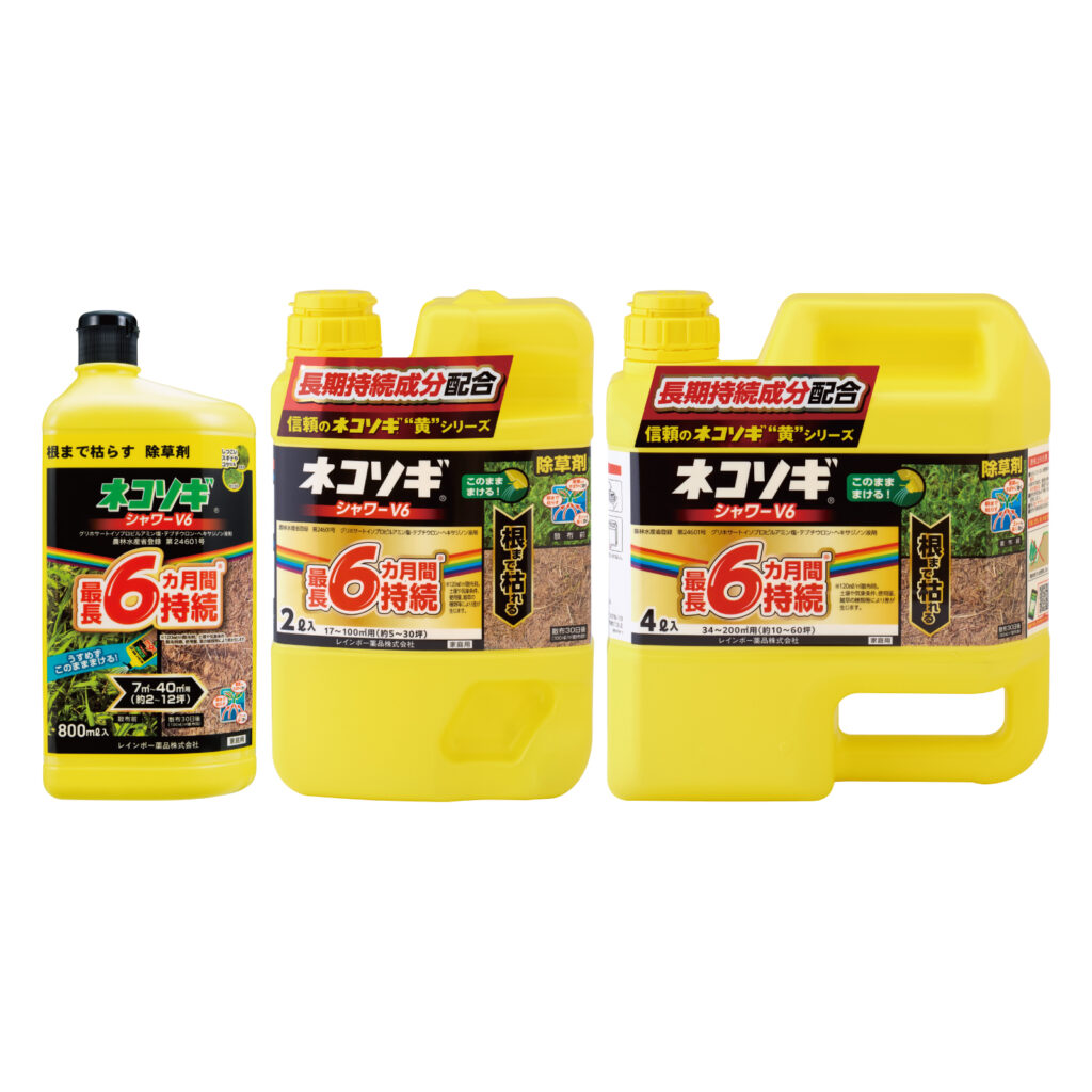 長期間雑草の発生を抑える効果もある液剤「ネコソギロングシャワーV9」「ネコソギシャワーV6」をおすすめします。