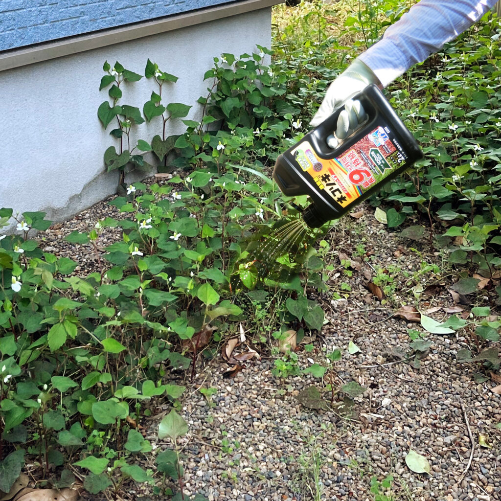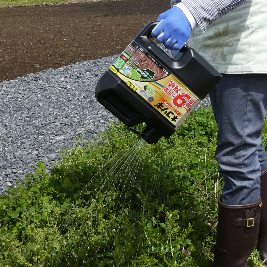 - 原液をそのまま、雑草の葉や茎が濡れるように散布します。長期間効かせたい場合には地面に十分量を散布する。